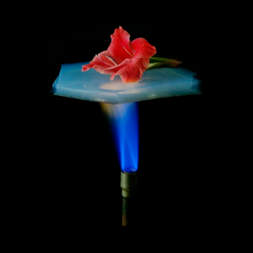 エアロゲルは複雑な螺旋構造をしています。この螺旋構造により熱伝導を遅らせます。写真の花のように、下から火を当てても損傷しません。