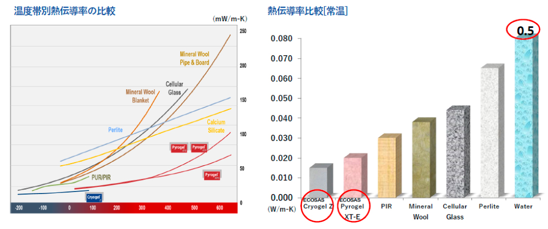 エアロゲル製品の特徴は、地球上の断熱材の中で一番低い熱伝導率を持つことです。一番右が水の伝導率を表記しています。グラフの水の伝導率は0.5に対してグラスウールやミネラルウールと比べても10倍以上の差があります。一般の保温材は時間が経てば水を吸収するので熱伝導率が非常に悪くなります。エアロゲルは水を吸収しないため熱伝導率に変化もなく常に能力を維持します。