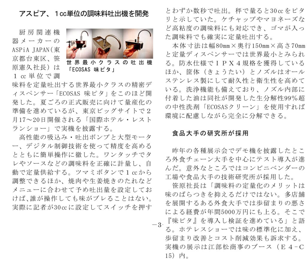 「週刊冷食タイムス」2025年6月3日号に調味料定量ディスペンサー「味ピタ」に関する記事が掲載されました。